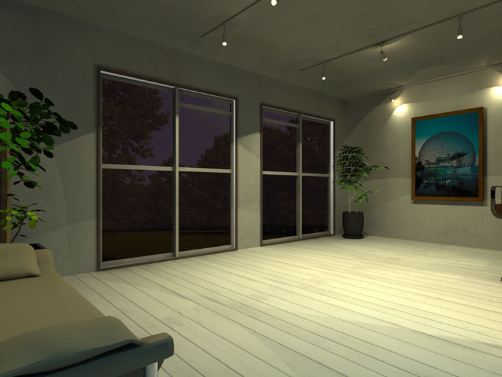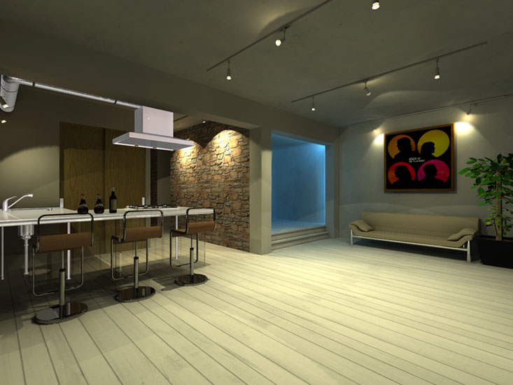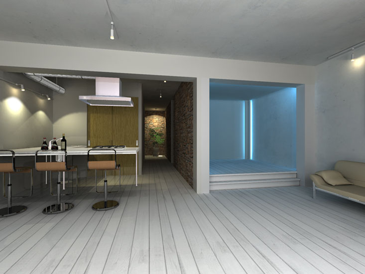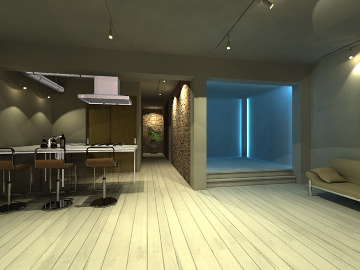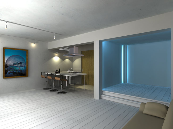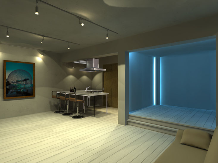 マンション・リノベーション物件。都心に立地するのでリビング・ダイニング・寝室をコンパクトに設計。寝室にはカラー間接照明を設置しシンプルな内観に変化を持たせている。
