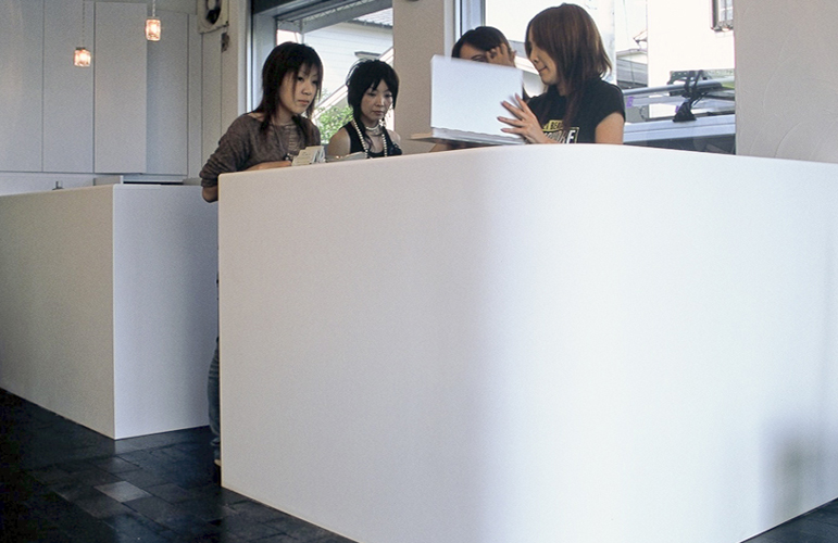 既存店から大きく逸脱する設計を目指すのではなく、丁寧に再構成することを念頭に置き設計に反映。デゥポン・コーリアンを多用し深みのある白を演出。素材の特性であるR形状をメインのカウンターに配置しシンプルであるがやわらかいイメージが出るように考慮。