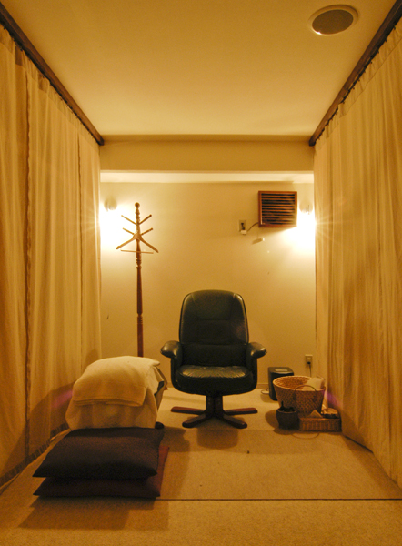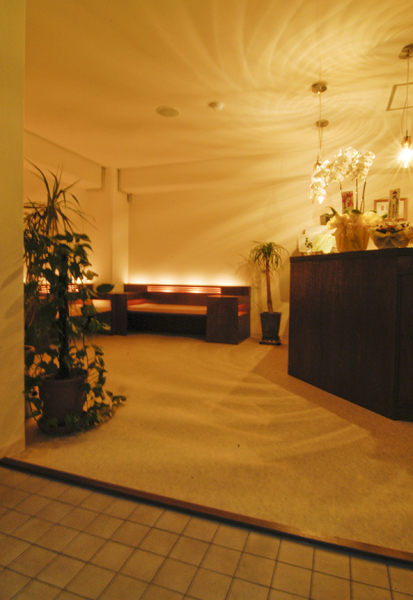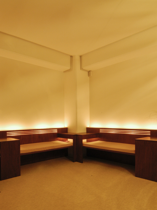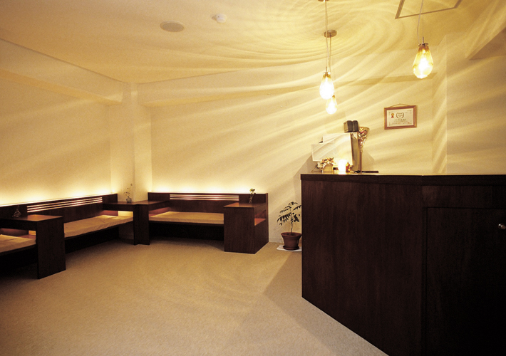 照明と空間構成でリラックス出来るデザインを演出。照明は最小限に抑え、間接照明で柔らかく。個室は六角形とし、中に入ると想像以上に広く感じられる空間になるようにギミックを設計として演出し非日常な感覚になれるよう考慮。